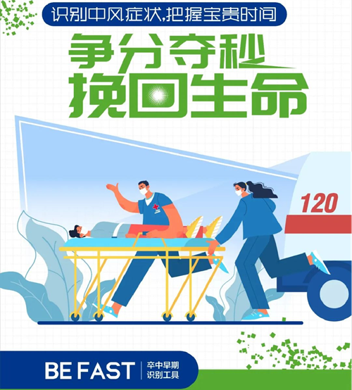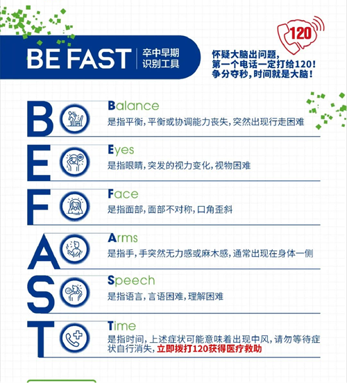 识别卒中早期症状的“BE FAST口诀”,前5个字母各代表一个早期症状,最后1个字母是提醒一旦发现卒中症状,就要马上拨打急救电话,立刻就医: