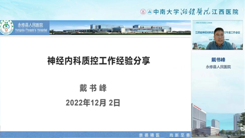 12月2日召开了江西省神经内科医疗质量控制中心2022年度会议,年会议邀请了永修县人民医院副院长戴书峰向全省同仁介绍了基层医院神经内科质控工作成绩,提出了质控工作的不足和改进措施,曹文锋做了《江西省卒中中心建设情况及质控数据分析》专题报告,徐仁伵对本年度江西省神经内科医疗质量控制中心工作进行了总结,并布置2023年度神经内科质控工作。
