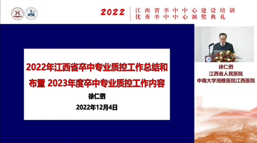 12月4日上午举行了江西省卒中中心建设培训会和优秀卒中中心颁奖典礼,表彰了我省在脑卒中高危人群筛查干预、卒中中心建设、关键适宜技术推广和健康宣教等方面作出积极贡献,大力推动卒中防治工作深入开展的优秀卒中中心单位,评选了31家2022年江西省高级优秀卒中中心、优秀3级卒中中心和静脉溶栓先锋卒中中心。培训会上,除了分享卒中诊疗新进展和经验,还总结了2022年江西省卒中专业质控工作,并对2023年度卒中专业质控工作内容进行安排,通报了中国卒中急救地图建设标准和省内的相关情况。