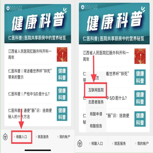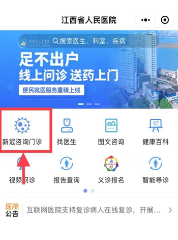或者关注微信服务号“江西省人民医院”→菜单第一栏“核酸入口”→“互联网医院”即可问诊。