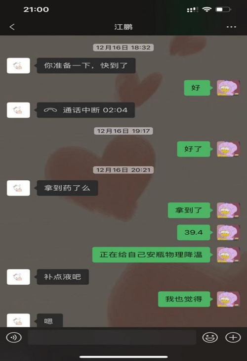 12月中下旬,随着感染新冠病毒的患者增多,江鹏这个时候也开始出现症状,最严重的一天,出现了40℃的高热,并且伴有剧烈的咳嗽导致口鼻出血。但面对同事关心,想到病危的病人,江鹏仍旧选择坚守岗位,服药降温后,又再次出现在了病人床旁。