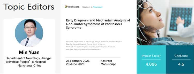 近日,江西省人民医院(南昌医学院第一附属医院)·中南大学湘雅医院江西医院(国家神经疾病区域医疗中心建设项目)神经内科医师袁敏受邀担任神经科领域知名国际期刊《Frontiers in Neurology》(JCR二区,IF=4.086)客座主编,并负责组建名为《Early Diagnosis and Mechanism Analysis of Non-motor Symptoms of Parkinson's syndrome》(帕金森综合征非运动症状的早期诊断及机制分析)的前沿专刊(Research Topic),联合江西省人民医院、江西省神经病学研究所副所长潘海莉教授,美国约翰霍普金斯大学医学院韩梅教授以及中南大学湘雅医院徐倩教授共同编辑。