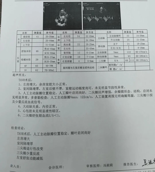 1月11日中午,在洪浪及李林锋的主刀下,手术有条不紊地进行着。先施行右冠脉PCI术,接着在诱导麻醉状态下实施TAVR手术。整个手术过程顺利,耗时仅1个半小时。术后罗大爷即刻清醒,能自主交谈,听诊主动脉瓣区杂音明显减弱,复查心脏彩超提示主动脉瓣未见明显瓣周漏,心功能明显改善。术后第二天查房,罗大爷自述胸闷痛、气促等症状明显缓解,血压、心率平稳,谈笑风生,容光焕发,5天后康复出院。整个术后天数及手术过程体现了短、平、快,不仅大大缩短住院时间、节省费用,且手术见效快,得到患者及家属的认可,提高了患者满意度。