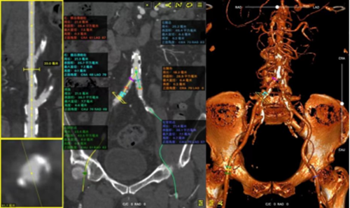 在等待择期TAVR手术的过程中,因新冠防控措施全面放开,罗大爷不幸感染新冠病毒。在回家调养休息半个月后,“阳康”的罗大爷于1月8日再次返院。洪浪及李林锋积极组织我院TAVR团队(包括心内科、心外科、麻醉科、超声科、CCU)进行相关术前讨论。总结病例特点如下:1.Type1型(横裂式)二叶瓣,重度钙化,钙化延伸窦底,瓣口面积0.48;2.患者室间隔增厚,心室较小,左右冠瓣叶较长,窦宽相对瓣膜可,右冠存在风险,瓣膜释放可回收极限处评估冠脉,弓部角度可;3.手术入路:双侧股动脉不迂曲,分叉低,左右髂总钙化斑块、溃疡,股动脉内径稍小;4.瓣膜球囊选型:建议20mm球囊,首选TAV27,备24。