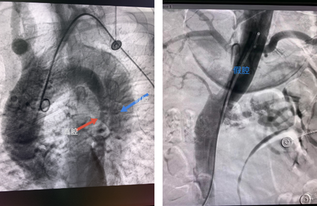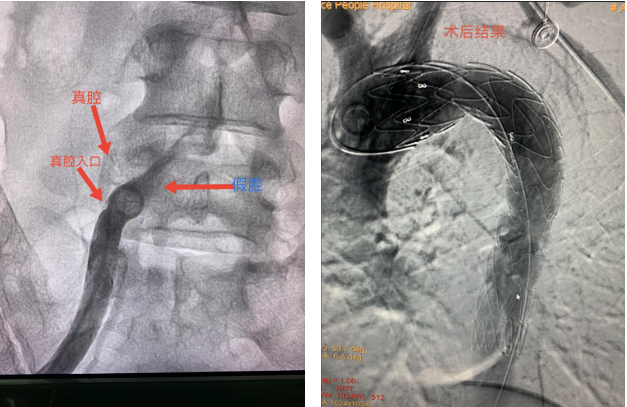 因患者主动脉破口降主小弯侧,破口大,全程假腔大真腔极小,远端破口多,夹层累及双侧髂动脉,左肾、腹腔干真假腔供血,右肾及肠系膜真腔供血,手术难度大。手术过程非常紧张,功夫不负有心人,终于在右髂探寻到极小真腔影,在JR导管下泥鳅及J型都无法进入,欧阳长生灵机一动改用PTCA导丝进入,小心造影证实真腔后建立轨道,顺利完成隔绝,患者术后情况良好,返回病房。