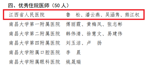 为进一步推进江西省住院医师规范化培训工作深入开展,激励广大指导医师、在院住培医师和各级管理工作者更加积极主动参加住培工作,营造良好培训氛围,激发责任感和使命感。江西省卫生健康委员会科教处近几年对江西省各住培基地开展住培优秀人物评选活动,经各住培基地自主申报、推荐和省内专家评议后确定相关奖项获奖人员。