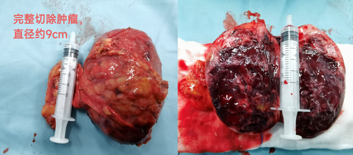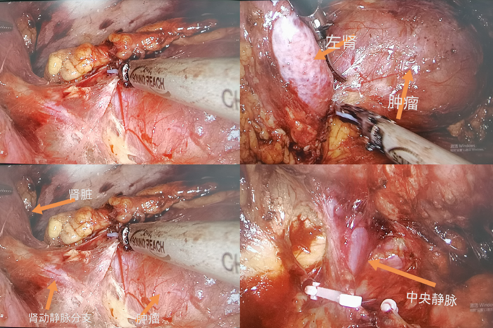 该肿瘤体积约89mmx54.8mmx71.32mm,血供丰富,位置很特殊,肿瘤紧贴左肾、左肾动脉、左肾静脉、中央静脉、脾动脉、脾脏、胰腺、肾脏、膈肌等组织器官,术中损伤任何一个血管都有可能导致大出血,损伤任何一个器官都可能需要同时切除该器官。而且该肿瘤内部有出血坏死等液体,并非完全实性肿瘤,由于肿瘤体积大,周围没有间隙,为了切除肿瘤,术中如果过多用力挤压肿瘤不仅会导致患者血压剧烈上升,而且容易造成肿瘤破裂,肿瘤一旦破裂,万一肿瘤为恶性将导致肿瘤种植转移,术后容易复发。