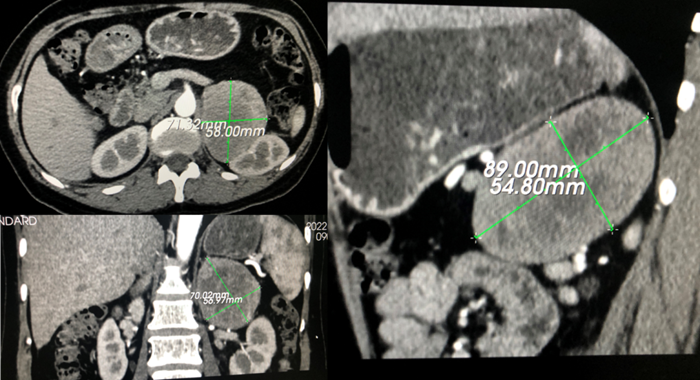 肖女士今年56岁,因左侧腰痛及头痛至外院就诊,检查发现左侧肾上腺巨大占位1周,经多方咨询后,慕名找到江西省人民医院泌尿外科贾灵华副主任医师,入院后完善相关检查后考虑嗜铬细胞瘤可能性大。