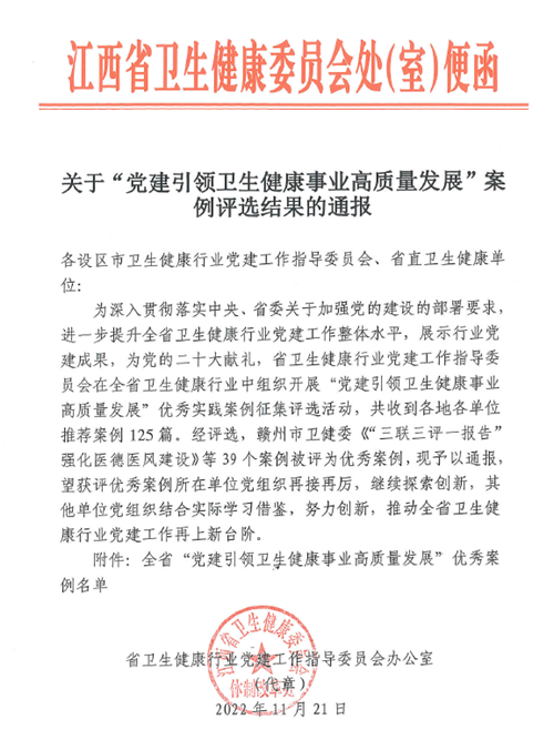 | 喜报!江西省人民医院一案例获评全省“党建引领卫生健康事业高质量发展”优秀案例 |