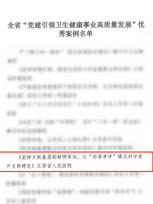 近日,从江西省卫生健康委获悉,“党建引领卫生健康事业高质量发展”案例评选结果出炉,在全省卫生健康行业各地各单位投递的125条推荐案例中,39个案例获评优秀案例,江西省人民医院(南昌医学院第一附属医院)党建工作案例《坚持大抓基层的鲜明导向 以“四季考评”模式科学提升支部建设》获评优秀案例。