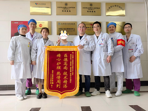 2023年3月6日上午,江西省人民医院(南昌医学院第一附属医院)-省心血管病医院十科患者蔡女士终于康复出院了,脸上露出了轻松的笑容,携同家人一道送来了“医德高尚、技术精湛;精心护理、热情周到”的锦旗,并和医护人员留下珍贵的合影,以表达对医护人员及时救治让自己转危为安的感激。