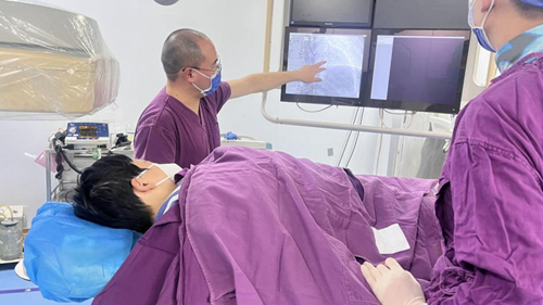 入院后再次行心电图检查,显示V1-V3导联Q波,ST段明显抬高,值班医生胡菁诊断为急性心肌梗死,并立即向江西省人民医院副院长、省心血管病医院院长洪浪汇报。结合患者发病时间、心电图等情况,洪浪决定立即启动胸痛中心,为患者行急诊行经皮冠状动脉介入治疗(PCI),尽快安全有效开通该狭窄甚至闭塞的冠状动脉血管,尽快改善心肌的血流灌注。