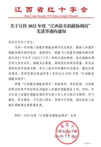 | 喜讯!江西省人民医院胡淑琴获评2022年度“江西最美捐献协调员” |