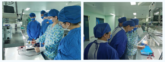 接着来到了器械检查包装及灭菌区,曾娟娟、黎云霞、周爱国向大家介绍了清洗消毒后器械的检查、保养、装配、包装以及包装材料的选择,压力蒸汽灭菌器、过氧化氢低温等离子灭菌器、低温蒸汽甲醛灭菌器和环氧乙烷灭菌器的灭菌原理、适用范围、监测方法及注意事项;现场演示了绝缘检测仪用法及精密器械检查保养与包装全过程;强调在日常工作中要注重对器械清洗质量、功能的检查以及对器械功能的保护等。