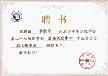 | 李淑玲连任中华护理学会第28届消毒供应中心专业委员会副主任委员 |