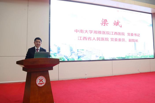 中南大学湘雅医院院长、中南大学湘雅医院江西医院院长雷光华,江西省人民医院党委副书记、院长陈志平,中南大学湘雅医院副院长张乐(主管湘雅江西医院),江西省人民医院副院长、中南大学湘雅医院江西医院提名党委书记梁斌,江西省人民医院党委委员、组织人事处处长魏筱丽等出席此次会议,会议由中南大学湘雅医院江西医院副院长、神经内科执行主任冯莉主持。