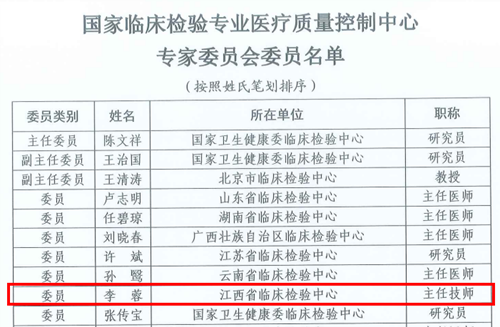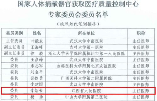 其中,江西省人民医院(南昌医学院第一附属医院)两名专家上榜:李新长主任医师入选国家人体捐献器官获取医疗质量控制中心专家委员会委员名单,李蓉主任技师入选国家临床检验专业医疗质量控制中心专家委员会委员名单。