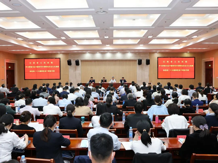 2023年5月12日,江西省人民医院(南昌医学院第一附属医院)学习贯彻习近平新时代中国特色社会主义思想主题教育读书班在省委党校主校区开班。中共江西省委党校(江西行政学院)常务副校长曾志刚开讲第一课,省委党校(江西行政学院)一级巡视员罗志坚出席仪式并讲话,省卫生健康委党组成员、院党委书记钭方芳作开班动员,党委副书记、院长陈志平及其他在家院领导出席,省委党校干部教育学院副院长、二级调研员全敏刚主持。医院副处级中层干部,各党总支书记、副书记,各支部书记、委员及小组长、专职党务干部共180余名学员参加学习。