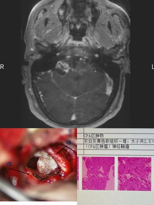 据悉,患者是一名68岁张大爷,6个月前感觉右耳听力下降、右侧面部皮肤麻木不适,起初麻木程度较轻,范围小,未予重视,后期麻木范围逐渐扩大至耳前、颞部及颌面部分皮肤,右耳的听力进行性下降,尽管妻子在右边大声说话,依然会出现错误理解,张大爷在当地医院就诊,检查后提示“听神经瘤”,经多方打听介绍后遂至我院,找到习斌求诊。入院后完善相关检验检查,MRI提示:右侧桥小脑角区见范围32*20*24mm不规则混杂信号囊实性肿块影,符合手术适应症,考虑手术部位涉及内听道和桥脑小脑角,手术复杂、风险高,且有面瘫、听力丧失、颅内出血等风险,经科室分析讨论,与患者及家属充分沟通同意手术后,习斌根据患者自身特点制定一套全面的手术方案,于2023年4月24日开展手术。术后右侧听力明显好转,右脸麻木消失,面神经功能完全正常,术后第四天便出院。“你们服务周到,治疗效果好,老伴术后恢复得快,这些离不开习主任精湛的医术和护士长的护理团队,太感谢你们了。”患者的妻子说。