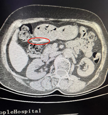 据悉,76岁的李奶奶因反复上腹部疼痛难忍来院就诊,经过一周治疗后,情况并未好转,于是再次来院检查,江西省人民医院进贤医院党委书记邹清水关注到这一不寻常情况,安排副院长曾炳亮再次检查,行胃部CT提示:胃窦内条状高密度影,提示异物影可能;并向家属解释怀疑胃内有金属异物(大约50毫米),考虑患者病情随时可能加重,决定进行手术治疗。副院长黄勤立即联系省人民医院消化内科副主任医师曾俊连夜赶往进贤医院与影像科、普外科、麻醉科、手术室多学科联合会诊,反复研究讨论患者情况,经过详细的检查和评估,为减少患者手术创伤,减轻病人痛苦,与家属积极沟通后建议先行胃镜下异物取除术,如异物无法从内镜下取出,则改行腹腔镜下腹腔异物取出术。