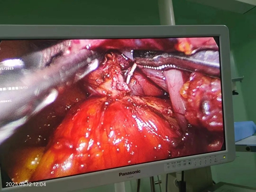 5月12日上午,在取得家属同意,完善术前准备后,省人民医院曾俊、进贤医院副院长许新平带领普外科负责人徐小云及其团队,在麻醉科、手术室全力配合协作下行“胃镜下异物套取术+腹腔镜下腹腔异物取出术+空肠营养管置入术”,胃镜检查发现异物完全刺入胃壁,内镜下无法取出。遂改行腹腔镜下手术,手术中发现胃前壁异物刺出,局部大网膜包绕,局部已形成了脓肿,分离后发现“注射针头”样异物,术中顺利取出异物并修补胃穿孔,手术配合紧密。