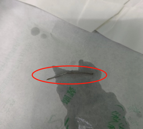 术后测量“注射针头”样异物约50mm长。术后了解情况得知,李奶奶在家吃韭菜时误食进入体内。经过科室医护人员悉心照料后,康复出院!