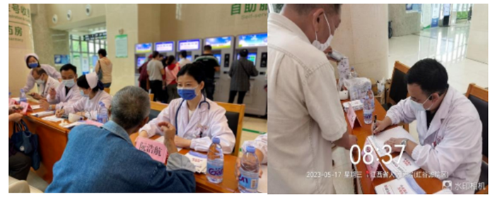2023年5月17日,为第19个“世界高血压日”,为普及高血压相关知识,关注高血压带来的危害,加强公众对高血压疾病的重视,江西省人民医院(南昌医学院第一附属医院)-省心血管病医院高血压达标中心在红谷滩院区门诊大厅开展主题义诊和科普患教活动。参与义诊活动的专家有江西省人民医院党委委员、副院长、省心血管病医院院长洪浪,心电生理科主任、省心血病医院五病区高血压组组长阮浩航,省心血病医院五病区副主任医师胡耀等。