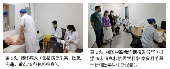 本次核医学专业住院医师规范化培训结业临床实践能力考核采用国际通行的客观结构化临床考核(OSCE)方式,共设病人接诊、医疗文书书写、临床思维与决策、基本技能操作、专科技能操作5个考站,通过使用标准化病人、核医学影像资料、随机抽取基本技能操作等手段,公正、客观、科学地考核住培生的临床技能,包括病史采集、体格检查、专科诊断报告、心肺复苏和气管插管、病例影像分析等。