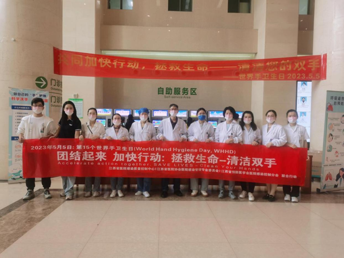 2023年5月5日是第15个“世界手卫生日”。为更好传播感染防控理念,强化手卫生在感染防控、守护公众健康中的作用,推广普及手卫生知识,普及文明健康生活方式,增强群众自我防范意识和防护能力,江西省人民医院(南昌医学院第一附属医院)开展了以“团结起来,加快行动:拯救生命-清洁双手”为主题的宣传活动。此次活动由感染管理处组织,宣传外事处、预防保健处、门诊部、消毒供应中心、口腔科、输血科、医院书画组等处(科)室参与,院党委委员、副院长梁斌出席、致辞并参与宣传。