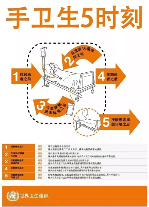 世界卫生组织推荐手卫生“五大时刻”,请您记住“两前三后,把好五关”: