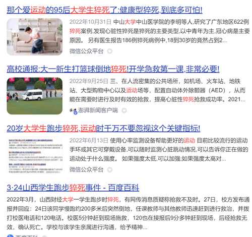 2021年国务院颁布的《全民健身计划(2021-2025年)》中提出要广泛开展全民健身运动赛事,提升科学健身指导服务水平。运动是健康生活中的重要部分。校园里,军训是每一个入校新生必修的体能训练,足球、篮球、羽毛球、田径等运动形式被越来越多的人选择。运动强度的增加,心血管疾病风险也会随之增加。一项高校内发生运动猝死的原因调查表明,高强度运动会增加急性心肌梗死和心脏猝死的风险,篮球、足球、田径赛跑等高强度运动中急性心血管事件的发生率高于其他项目。高强度运动中,青年运动性猝死的人数近十来年不断上升,成为社会关注的议题,甚至1个月中就发生了数起大学生运动猝死的事件:广州国际马拉松赛上一大学生运动猝死;上海某高校1000米测试一大学生运动猝死;湖北某高校1000米测试一大学生运动猝死……运动猝死虽然没有运动损伤那样高的发生频率,但它发生的突然性和严重性要远超运动性损伤。因此在高校体育锻炼具体开展过程中,运动安全与心脏安全不可忽视,其关系到大学生身体健康乃至生命安全。