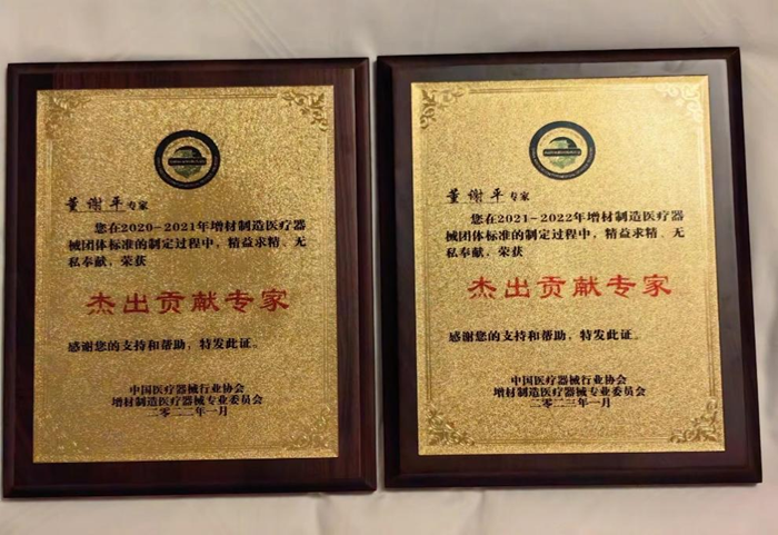 | 喜讯!董谢平再获增材制造医疗器械团体标准制定“杰出贡献专家”称号 |