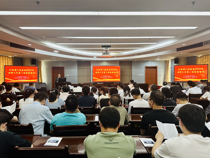 在全党深入开展学习贯彻习近平新时代中国特色社会主义思想主题教育之际,2023年5月19日、5月24日,江西省人民医院(南昌医学院第一附属医院)在爱国路院区分别举行2023年进修人员岗前培训。省卫生健康委党组成员、院党委书记钭方芳出席开班仪式并致辞,院长陈志平出席并讲话。培训班由医务处处长邹伏英主持。本次培训分两场进行,来自省内外各级医疗机构的医、护、药、技进修学员近300人参加培训。