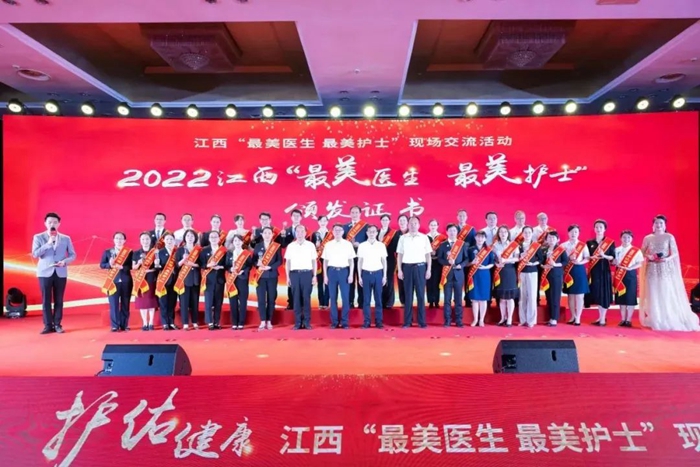 为深入开展学习贯彻习近平新时代中国特色社会主义思想主题教育,落实党的二十大精神,大力弘扬社会主义核心价值观,深入挖掘选树卫生健康行业先进典型,增强广大卫生健康工作者的职业荣誉感,在全社会形成尊医重卫的良好风尚,2023年6月5日,省委宣传部、省卫生健康委在南昌联合举办“医心为民 护佑健康——2022江西最美医生、最美护士” 现场交流活动,省政府副省长史可出席活动并为2022江西最美医生、最美护士颁奖,省政府副秘书长王海涛,省卫生健康委党组书记、主任龚建平,省委宣传部二级巡视员王宜华及省卫生健康委在家委领导出席活动。
