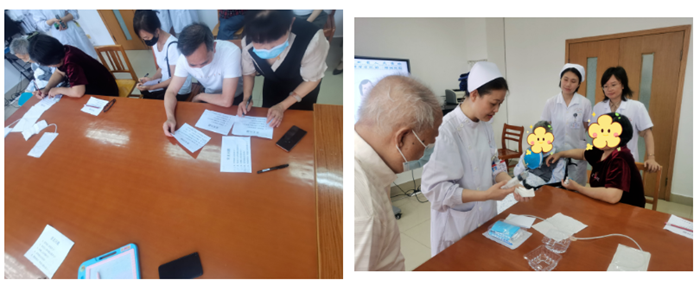 一部病区副护士长齐佳指导家属及护工人员实践操作:脉冲手法、鼻饲管的护理及维护等,又以问卷形式的授课,让大家对管饲饮食有全方位的了解和更清晰的认识,会场气氛热烈,讨论积极,得到了一致好评。