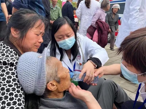 “医生快来,这里有位大爷晕倒了!”远处传来志愿者的紧急呼喊声,中南大学湘雅医院江西医院副院长冯莉及其他医务人员闻讯立即前往事发地,对大爷进行就地抢救,为其听诊、测量血压和心率。大爷呈重度贫血面貌,嘴唇发绀,全身湿冷,血压90/50mmHg,心率60次/分,初步诊断为贫血合并休克,积极给予补液等对症处理,大爷意识逐步恢复。经问诊,该患者合并多发基础疾病,病情复杂,建议尽快转当地医院进一步诊治。此时120救护车也赶到现场,大爷被及时安全送往当地医院,“真的太感谢了,多亏你们及时赶到!”大爷的家属感动不已,对医务人员连连致谢。