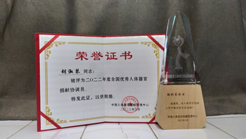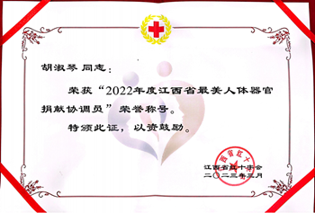 2023年4月1日,在湖南长沙召开的2023年全国人体器官捐献工作会议上,中国人体器官捐献管理中心公布了17名全国器官捐献协调工作的佼佼者,江西省人民医院(南昌医学院第一附属医院)胡淑琴荣获“2022年度全国优秀人体器官捐献协调员”荣誉称号。