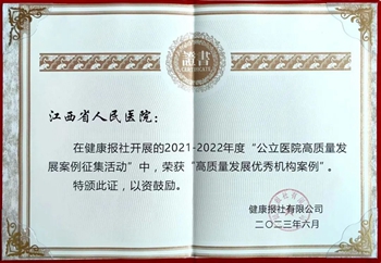 2023年6月17日,由健康报社主办的2023年度公立医院高质量发展推进暨国家区域医疗中心建设(太原)大会在山西太原举行。现场发布“2021—2022年度公立医院高质量发展案例”榜单,江西省人民医院(南昌医院第一附属医院)获评2021-2022年度“公立医院高质量发展优秀机构案例”。