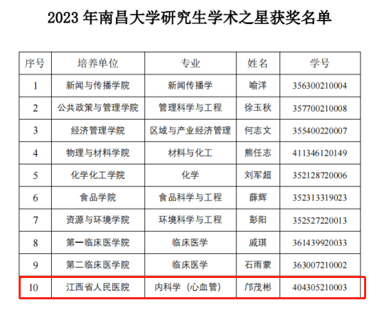 2023年7月3日,我院2名硕士研究生获得2023年研究生创新奖,其中2021级内科学(心血管)专业邝茂彬被评为2023年南昌大学研究生“学术之星”,2020级眼科专业淦帆获得研究生创新二等奖。