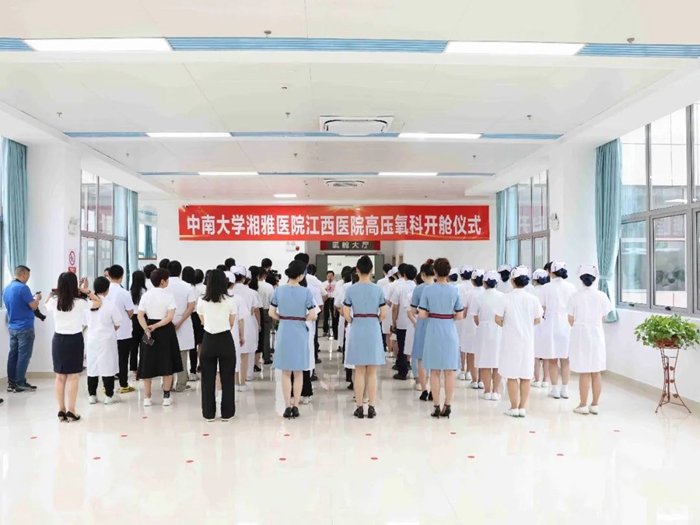 2023年6月30日上午,中南大学湘雅医院江西医院(国家神经疾病区域医疗中心)高压氧舱开业仪式在红谷滩院区2号楼高压氧科举行,高压氧舱采用的是大型医用空气加压氧舱,为三舱七门结构,可同时容纳28人进行高压氧治疗。是省内首个全舱采用一级供氧(直排供氧)装置,高压氧治疗支持设施条件居省内首位,有智能计算机自动化操舱系统,空调系统与安全检测系统等设施,配备有先进的心电监护仪、舱内呼吸机、脑仿生电刺激仪、经皮氧分压监测仪等。既能开展普通患者的常规治疗,也能满足危急重症患者的救治,同时能作出高压氧治疗效果的精准预判。