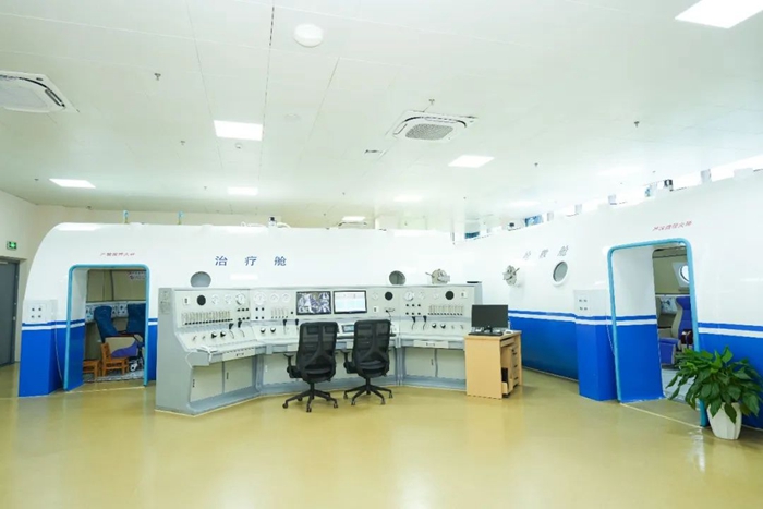 高压氧舱设备先进,省内首次采用全舱式一级供氧(直排供氧),可容纳28名患者同时进行治疗。直排供氧方式能减少呼吸阻力,便于年老体弱及危急重症患者的抢救。高压氧舱配置了心电监护、呼吸机等生命支持设备,同时配备脑仿生电刺激治疗仪及经皮氧分压监测设备,高压氧治疗支持设施条件居省内首位。