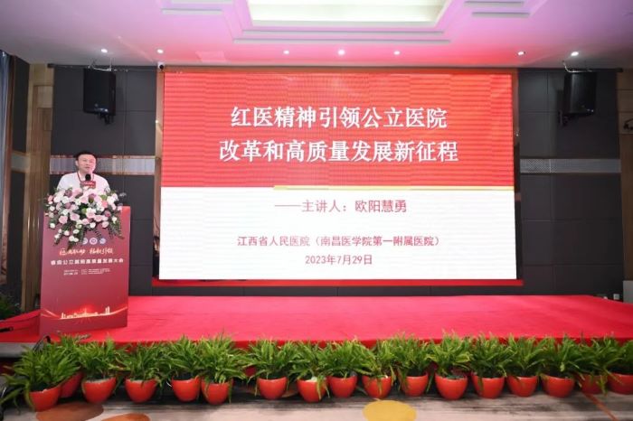 在“党建引领 内核驱动新征程”专题论坛中,欧阳慧勇以《“红医精神”引领公立医院高质量发展》为题向大会作主旨演讲。他结合自身学习体会和管理经验,围绕“红医精神”内涵、党建引领、医院高质量发展等方面,以大量数据、图文展示、案例介绍,向与会者分享江西省人民医院“红医精神”引领公立医院高质量发展的经验做法,得到与会专家的一致好评。他强调,省人民医院坚持以“红医精神”为引领,自觉把习近平新时代中国特色社会主义思想转化为坚定理想、锤炼党性、指导实践、推动工作的强大力量,为医院事业高质量发展凝聚强大力量。