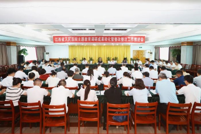 2023年7月21日,江西省人民医院(南昌医学院第一附属医院)召开主题教育调研成果转化暨整改整治工作推进会,认真落实党中央、省委和省卫生健康委主题教育工作部署,梳理调研成果转化和问题整改整治工作进展,深入交流研讨、集思广益对策,研究部署下一阶段工作重点,推动主题教育走深走实。省卫生健康委主题教育领导小组副组长、一级巡视员朱卫国同志到会指导,省卫生健康委党组成员、省人民医院党委书记钭方芳主持会议并讲话,省人民医院党委副书记、院长陈志平及全体在家院领导出席会议。