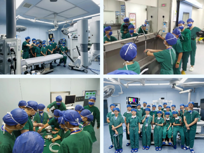 在5楼的手术室里“藏着”医院的高科技装备:第四代达芬奇手术机器人和各式各样的“镜子”,这些微创、精准、精密的仪器设备让孩子们目不暇接,赞叹连连。手术室副护士长蔡学菊告诉大家,最重要的是无菌观念,上台前必须规范操作、认真洗手,才能保证手术安全。孩子们学习了规范化的穿戴,“原来我妈妈常说的手术室和手术是这样的,和我们在电视上看见的不太一样。”