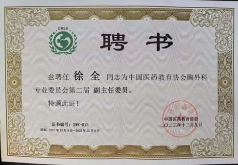 | 徐全当选中国医药教育协会胸外科专业委员会第二届副主任委员 |