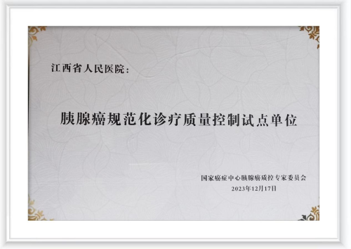 2023年12月17日,国家癌症中心胰腺癌质控专委会成立大会暨天津胰腺肿瘤多学科诊疗高峰论坛在天津召开,会上举行全国首批试点单位建设启动仪式,江西省人民医院(南昌医学院第一附属医院)获颁全国胰腺癌规范化诊疗试点单位证书。