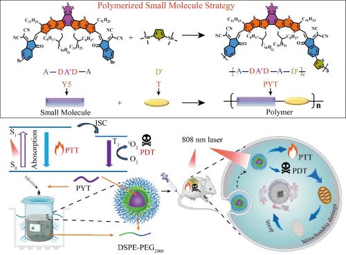 恶性肿瘤是老年人的常见病和主要死因之一。目前恶性肿瘤临床治疗措施主要包括手术、放疗和化疗,而老年患者对现有肿瘤常规治疗的耐受能力偏差,故更急需更加精准分子靶向治疗。近日,江西省人民医院(南昌医学院第一附属医院)老年医学研究所科研团队通过设计稠环小分子Y5与噻吩单元共聚合成PYT,并利用纳米共沉淀法制备纳米粒子PYT NPs。所合成PYT NPs具有良好的生物相容性、光稳定性、高光热转换效率以及激光照射(PYT NPs + NIR)下优越的活性氧(ROS)产生能力。体外和体内实验均证实PYT NPs + NIR通过光动力治疗(PDT)和光热治疗(PTT)方式发挥优异的抗肿瘤效果,且其治疗效果与线粒体损伤所诱导的细胞凋亡密切相关。本研究还创建了一种全新的光热剂(PTAs)和光敏剂(PSs)分子设计策略。