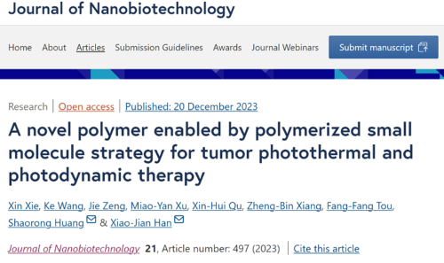 该研究成果已发表在国际权威期刊《Journal of Nanobiotechnology》 (影响因子10.2,中科院一区),论文题目:《A novel polymer enabled by polymerized small molecule strategy for tumor photothermal and photodynamic therapy》,文章链接https://doi.org/10.1186/s12951-023-02272-9。