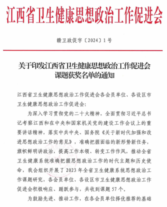 近日,江西省卫生健康思想政治工作促进会印发了《关于江西省卫生健康思想政治工作促进会课题获奖名单的通知》,江西省人民医院(南昌医学院第一附属医院)获评2023年度全省卫生健康系统思想政治工作课题研究一等奖1篇、二等奖2篇、三等奖1篇、优秀奖4篇,共8篇上榜。