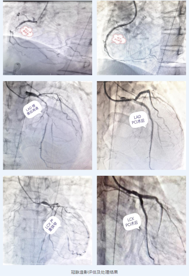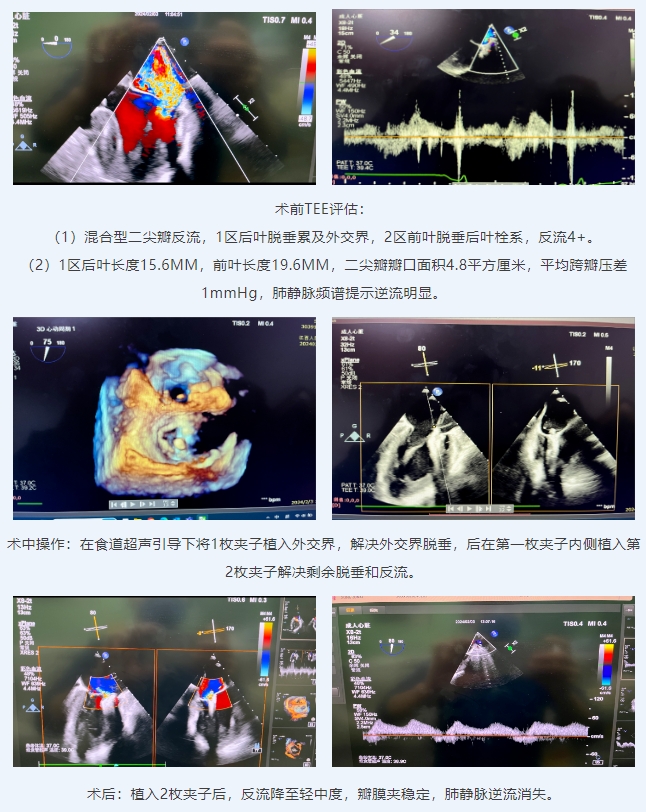 患者李先生(化名),因反复胸闷痛3周,加重2周,拟急性心肌梗死入院,立即送介入室行冠脉造影,前降支近中段狭窄90%,回旋支狭窄90%,右冠过第一道弯后最重,狭窄约95%%,立即行PCI,迅速开通病变冠脉。急性心肌梗死后,二尖瓣腱索断裂脱垂并重度关闭不全,二尖瓣极重度反流,外科会诊考虑患者心功能NYHAIV级,冠脉支架植入术后行外科手术风险大。经过详尽的检查,食道超声提示患者1区后叶脱垂累及外交界,2区前叶脱垂,后叶栓系,病情相对复杂。尹秋林团队经多次仔细评估,经过心血管外科、超声科、麻醉科、导管室及护理团队等多学科讨论后,决定为患者行经导管二尖瓣钳夹术。屋漏偏逢连夜雨,手术日期已定,患者术前突发消化道出血,病情急剧反转,增加了二尖瓣钳夹术的风险,尹秋林团队时刻关注病情变化,密切观察指标变化,在医护患三者的共同努力下,患者消化道出血情况得到好转,经评估后,再次进行详细的讨论,制定方案,手术终于如期进行。